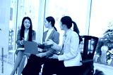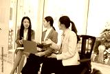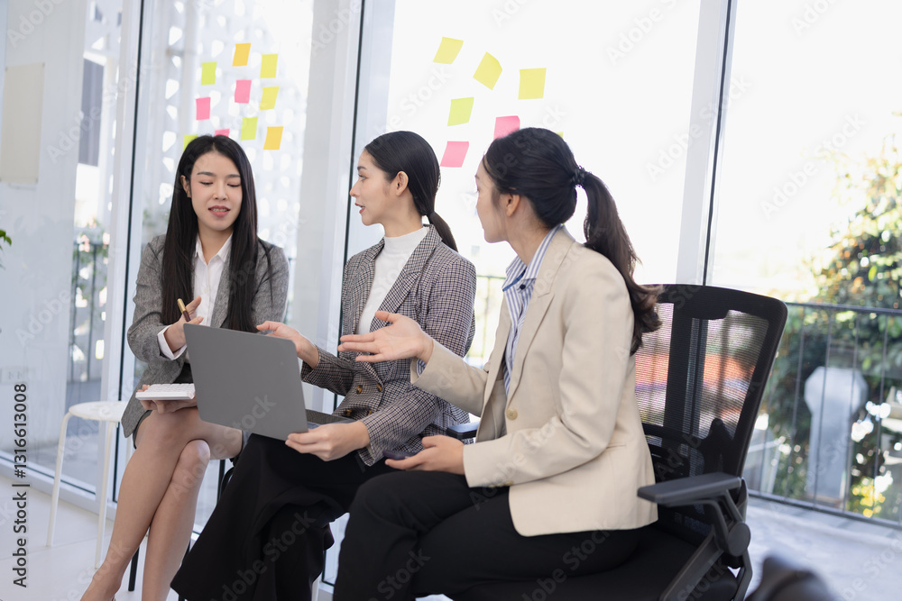 Three Asian businesswoman talking together with laptop and brainstorm sitting in modern office, Business startup and company strategy planning concept.