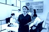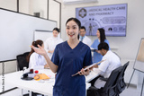 Healthcare and medical concept, Happy female doctor with clipboard standing in hospital.