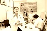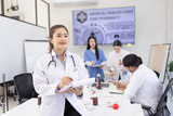 Healthcare and medical concept, Happy female doctor with clipboard standing in hospital.