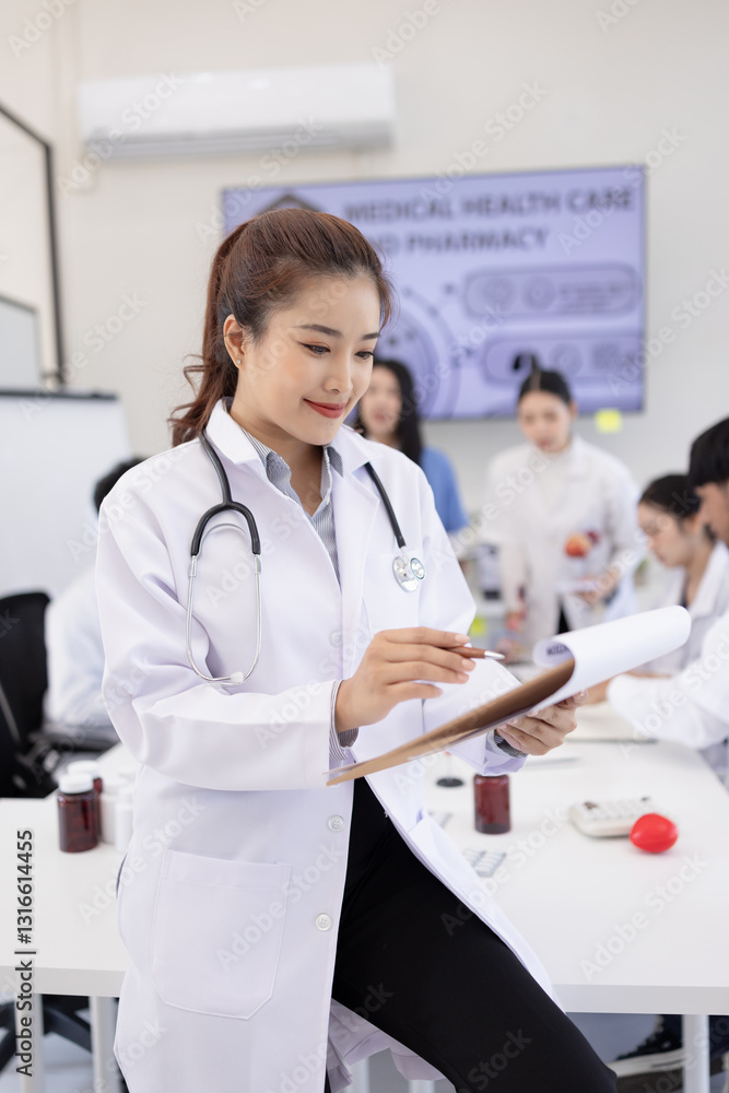 Healthcare and medical concept, Happy female doctor with clipboard standing in hospital.
