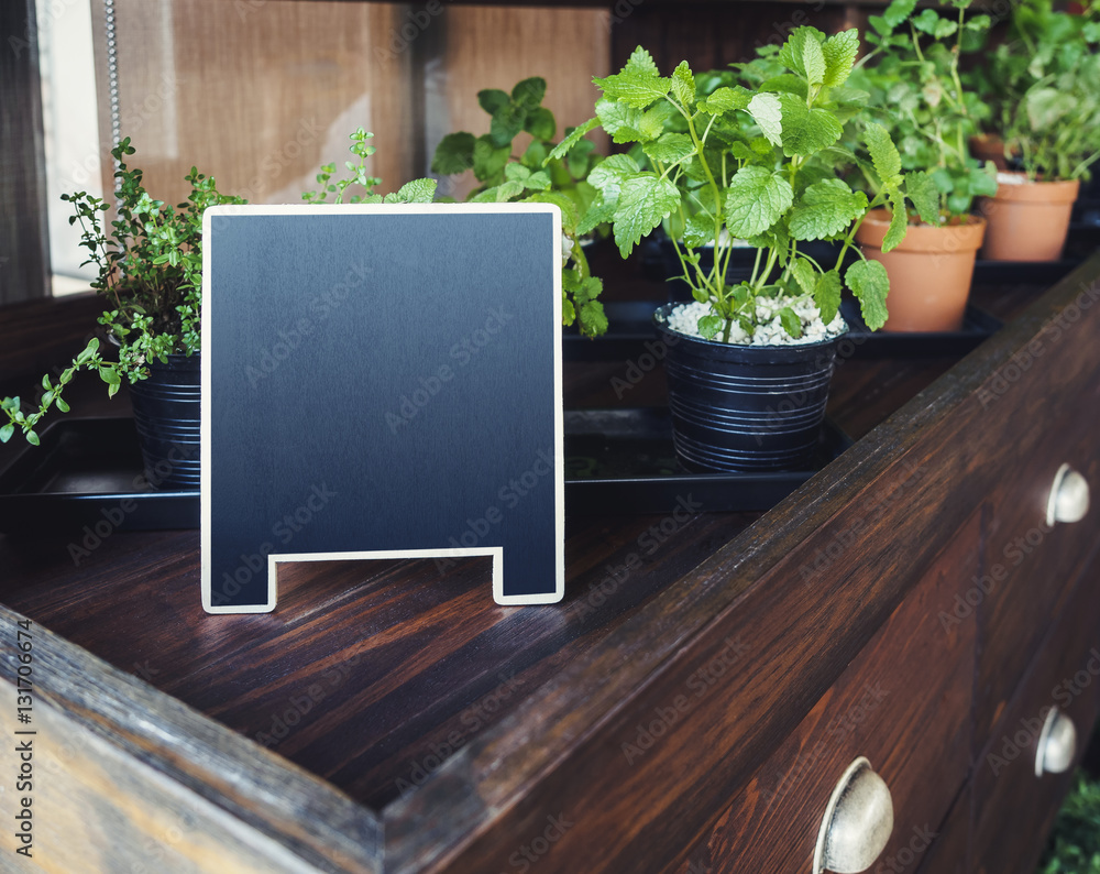 Mock up Menu Chalkboard stand with organic herb plants Home Gardening