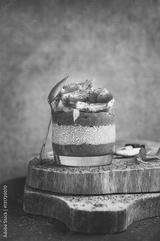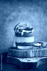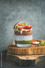 Healthy detox breakfast concept. Matcha, almond milk, cocoa chia seed pudding with fresh fruit, berries, mint, chocolate in glass over wooden board, grey wall background, selective focus, copy space