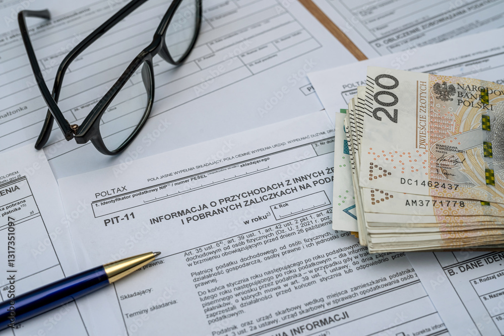 PIT 36 37 38 11 form on accountant with pln zloty money money bills calculator. CIT VAT tax forms