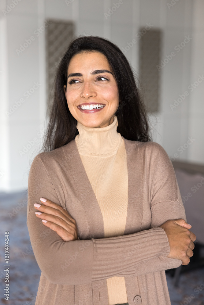 Beautiful Brazilian woman standing with her arms-crossed on chest indoor looks aside with joyful expression, take break at workplace, feels satisfied with productive workday, results and achievements
