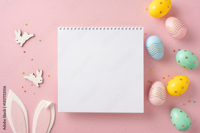 Top view of a blank notepad surrounded by Easter eggs, bunnies, and festive decorations against a pink background, offering space for holiday-themed messages or creative notes