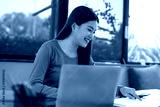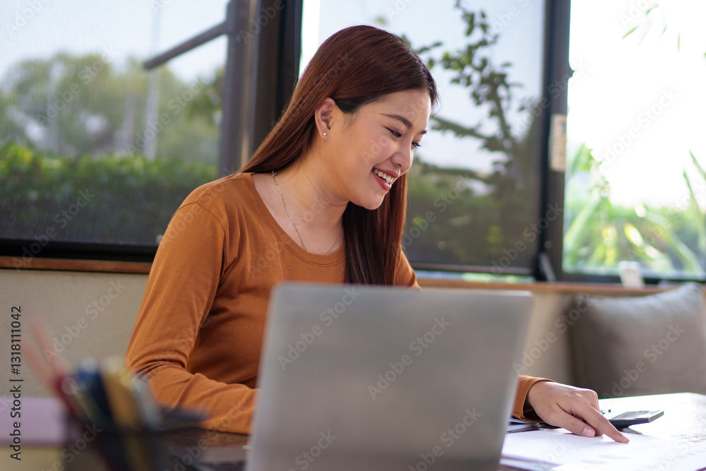 Businesswoman analyzing documents at a natural-themed office with a laptop, focused and dedicated to her work.