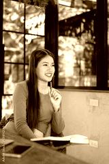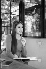 Businesswoman thinking with a pen in a natural-themed office, inspired and planning ideas for a new project.