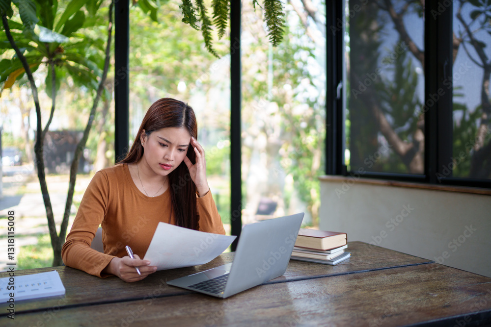 Businesswoman analyzing documents with a stressed expression in a natural-themed office, dealing with work challenges.