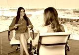 Latin female presenter interviewing a blonde celebrity at tv studio