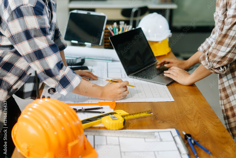 Two colleagues discussing data working and tablet, laptop with architectural project at construction site