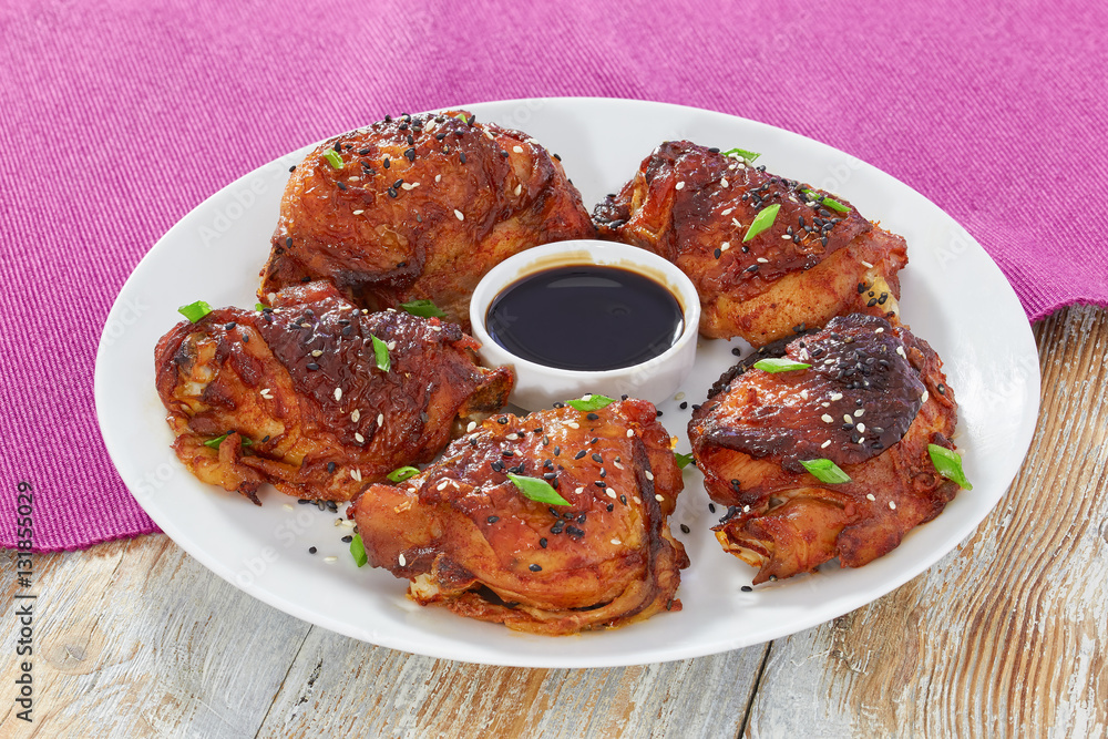 grilled chicken thigh on white plate sprinkled with sesame seeds