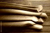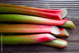 Juicy rhubarb stems on a rustic wooden table close up. Food photography