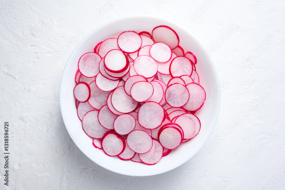 Fresh cutting radish slices in a white plate on white table. Vegetable salad. Food photography