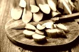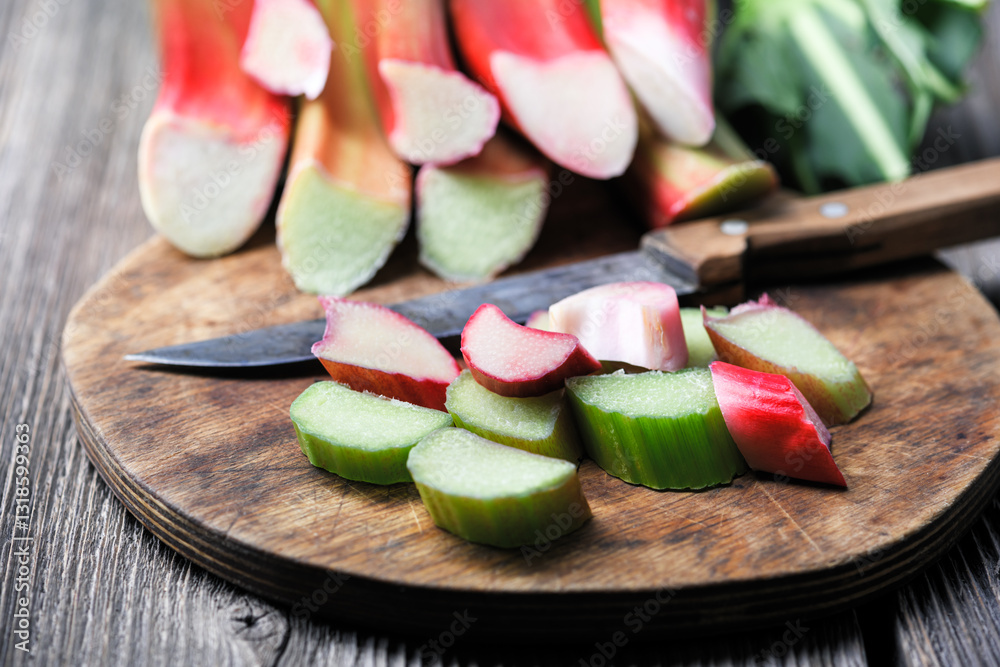Cutting ripe rhubarb stalks on a wooden cutting board close up. Food photography