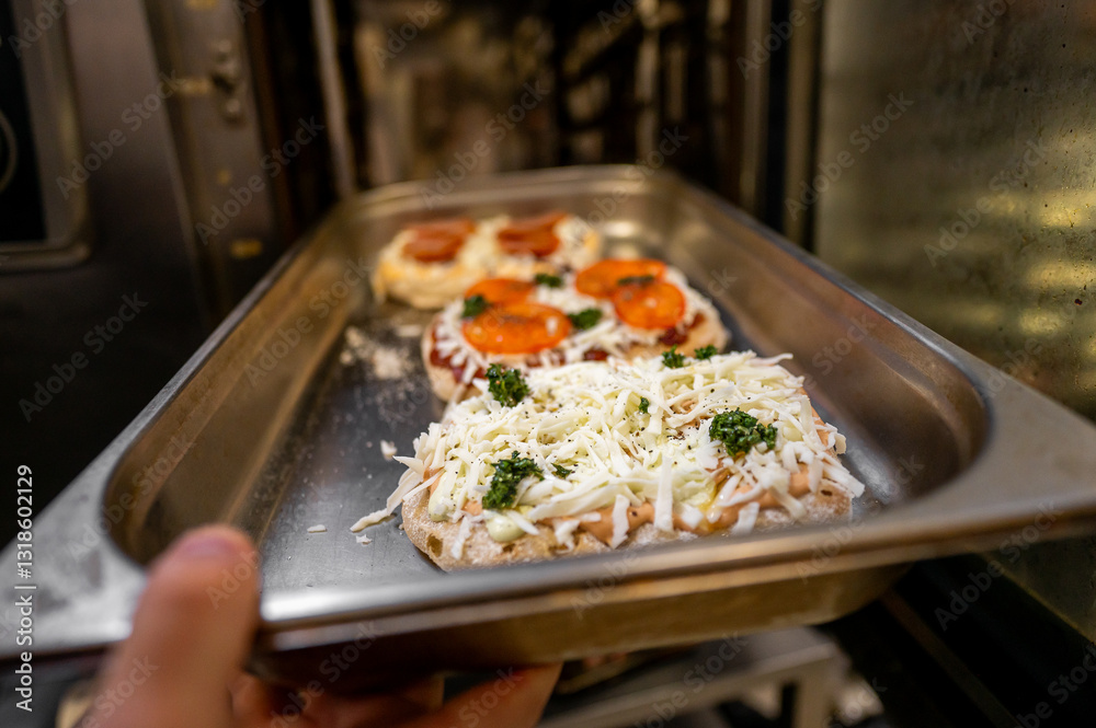 A hand holding a tray of small pizzas topped with cheese, tomatoes, and broccoli, inside an oven. The scene captures a delicious meal preparation.