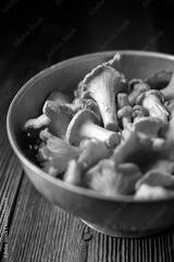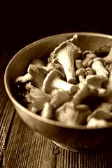 Close up of chanterelle mushrooms in old metal colander on a rustic wooden table. Food photography