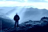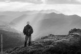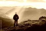 A photographer standing on the edge of a mountain covered in blooming rhododendrons. Foggy sunset sky with rays and high mountain ranges in the background
