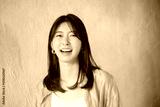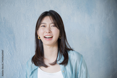 Woman in casual clothing looking up with smile on light blue background Front closeup looking at camera