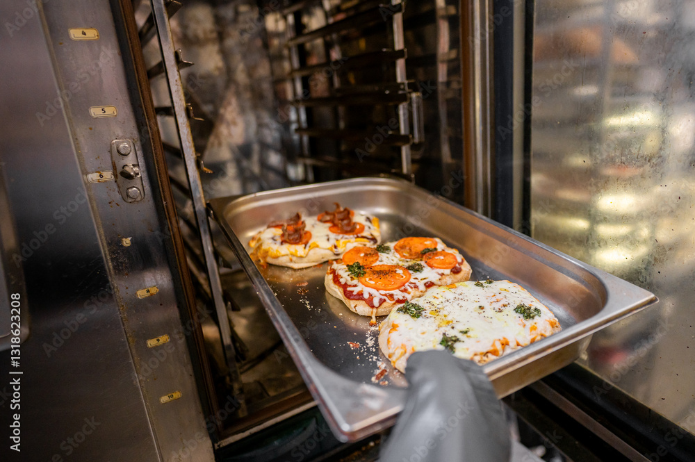 A chef removes a tray of freshly baked pizza from an industrial oven, showcasing delicious toppings like pepperoni and vegetables, ready to be served.