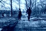 Two hikers walking on a forest trail in early winter or late autumn.