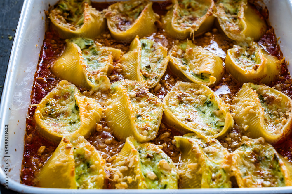 Pasta shells stuffed with cheese and spinach with tomato sauce in baking dish on black table