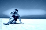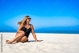 Summer holidays. Portrait of middle-aged beautiful woman sitting on white sandy beach on sunny day