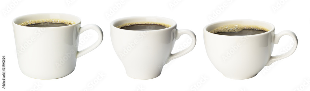 collection of black americano coffee filter and espresso in ceramic coffee mug with handle in difference size, side view isolated clipping path on white background.