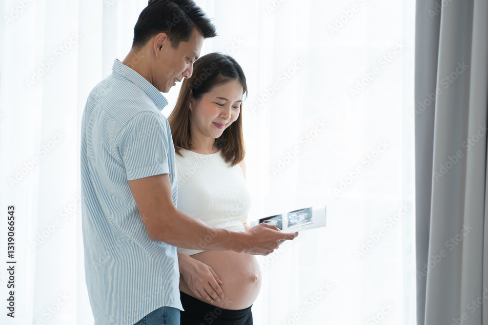 Cheerful Asian pregnant woman or wife with caring husband standing near window at home, smiling and looking at ultrasound image of their baby. Parenthood, bonding and expectant parents