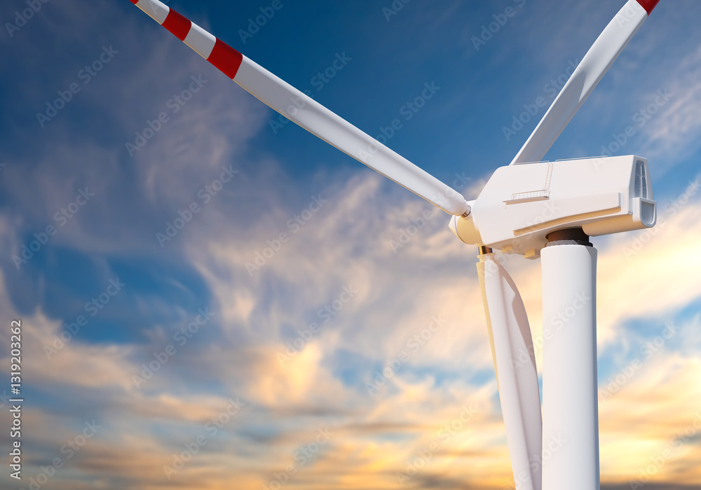 Wind turbine with rotating blades. Windmill near blue sky. Wind turbine for generating electricity. Modern power plant. Generating electricity from wind. Turbine for eco friendly current. 3d image