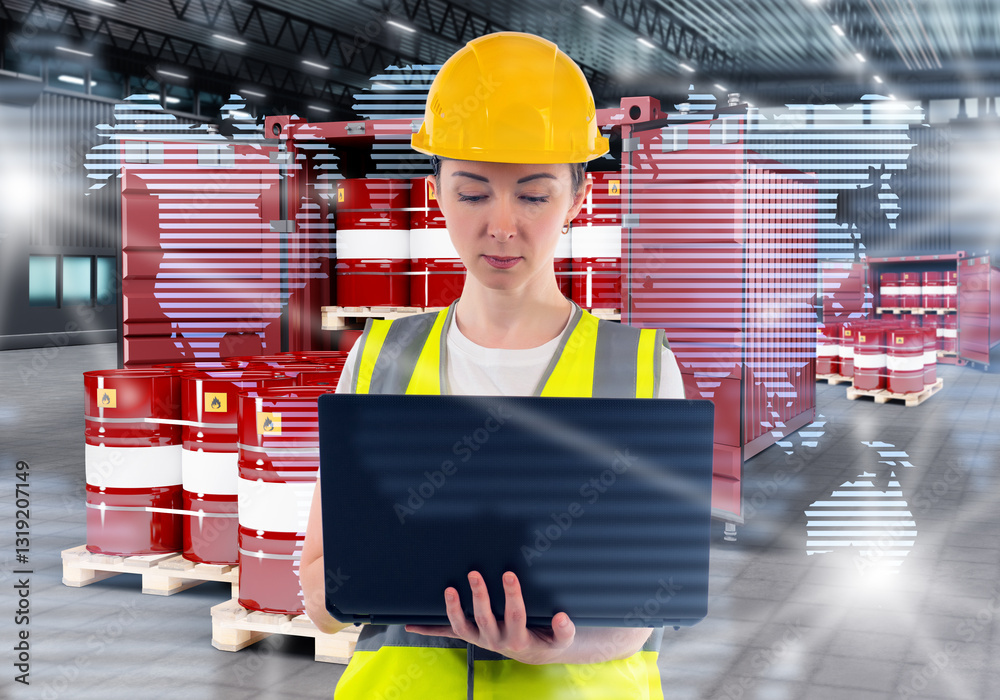 Woman near shipping container with barrels. Transportation petroleum products. Logistician with laptop in helmet. International logistics petroleum products. Logistician woman inside warehouse hangar
