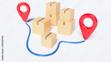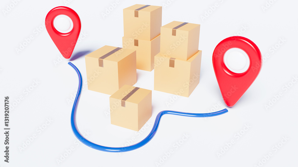 Delivery of goods. Boxes near logistics route. Route of courier delivery and parcels. Line from point A to point B. Parcels with goods are ready for delivery. Logistics route of courier. 3d image