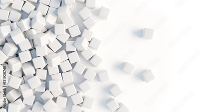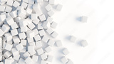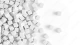 White background. Pile of cubes are scattered on surface. White background for design. Wallpaper with volumetric geometric elements. White background with minimalistic design. 3d image