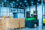 Logistics warehouse from inside. Forklift moves pallets with boxes. Modern warehouse inside hangar. Industrial building with logistics center. Warehouse of courier company. Man driving forklift