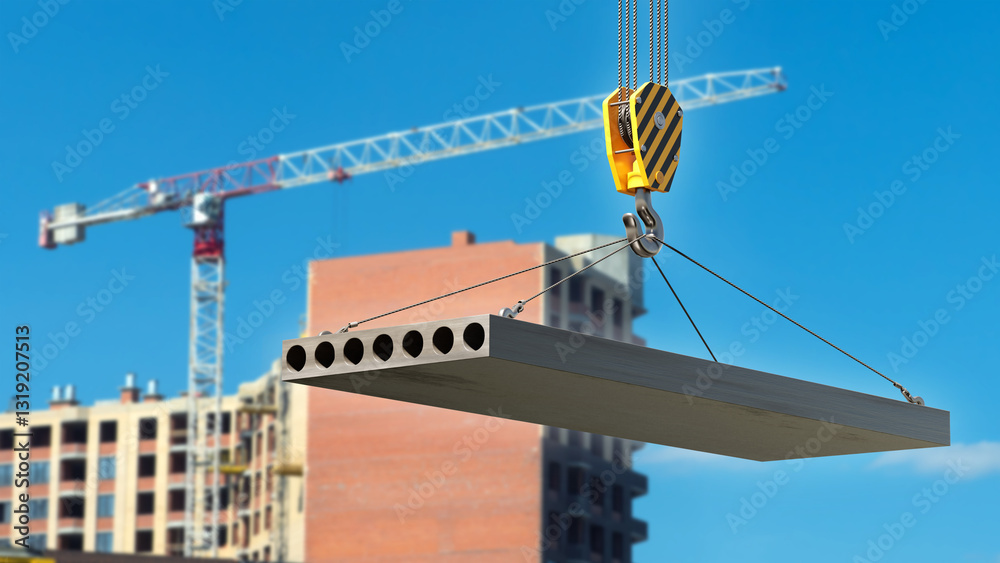Construction landscape. Concrete slab on crane hook near blue sky. Lifting load using construction winch. Erection of multi-storey residential buildings. Construction of residential skyscrapers