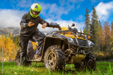 Man with phone near ATV. Quad bike driver uses smartphone navigation. Extreme racer stopped for break. Riding ATV off-road. Man quad biker in yellow helmet. Motorcycle SUV driver in picturesque place
