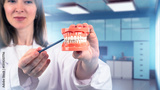 Woman dentist. Orthodontist demonstrates model of jaws. Dental treatment specialist. Mockup of healthy teeth in hands of dentist. Woman dentist in work office. Orthodontist in white coat
