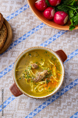 Rustic Lamb Noodle Soup on Geometric Tablecloth with Fresh Radishes