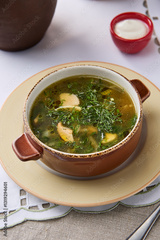 Rustic Mushroom Soup with Fresh Herbs in Natural Light Photography