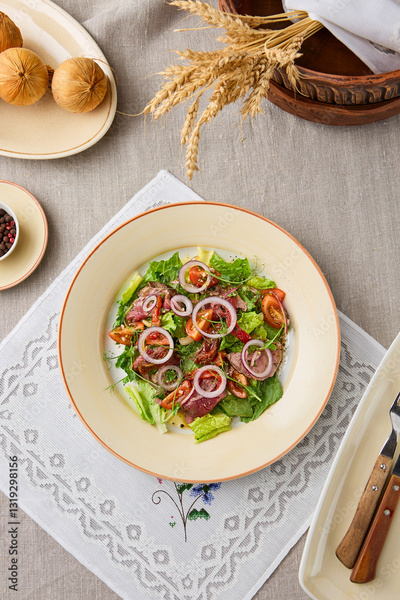 Elegant Roast Beef and Tomato Salad Rustic Elegance with Natural Textures