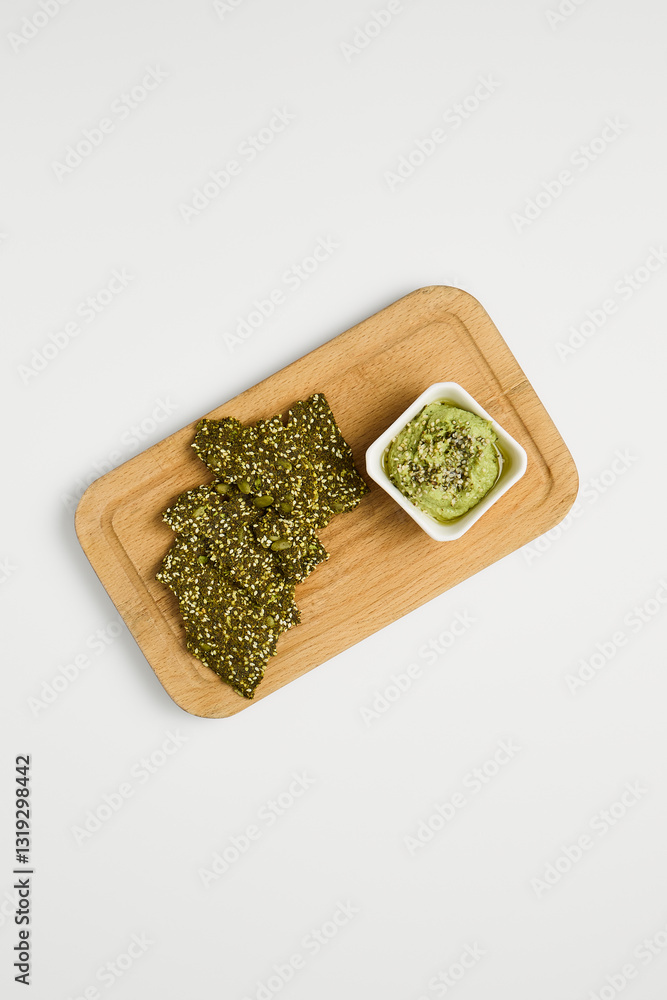 Minimalist Vegan Avocado Hummus and Grain Crisp Art with Natural Lighting