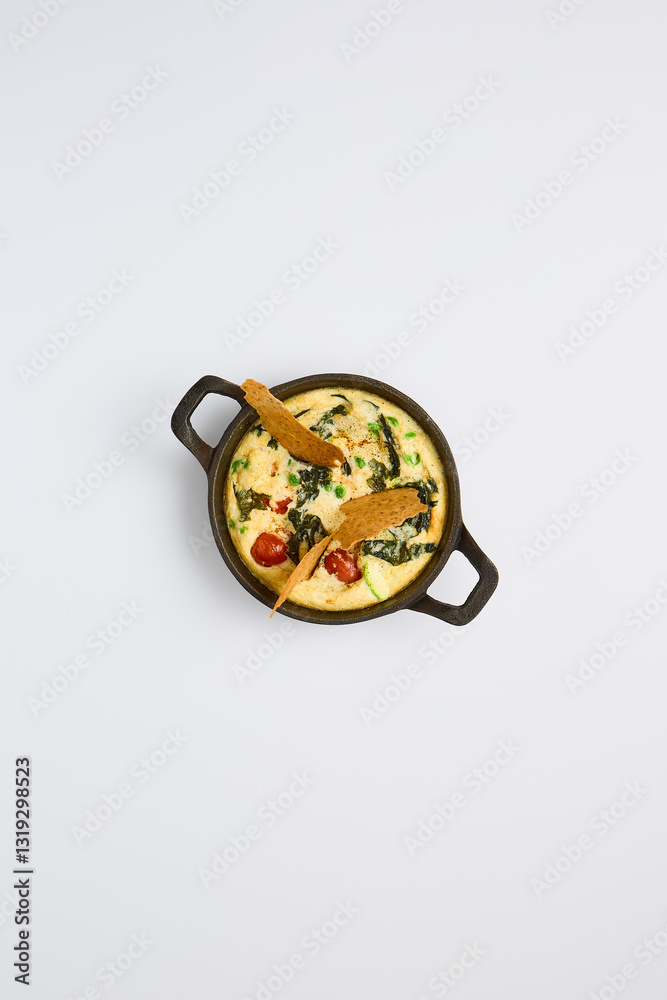 Artistic Omelet with Peas, Nori Seaweed, and Tomatoes in Minimalist Style