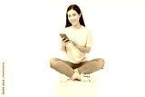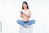 Cheerful young Asian woman sitting cross-legged on a white cube, engaging with smartphone. She wears T-shirt and blue jeans, smiling while interacting with the phone isolated on white background
