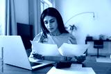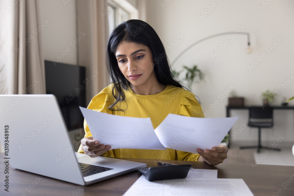 Indian woman engaged in financial work sit at desk with laptop, reviewing documents, checking papers for important details, analyzing contract, read data, looking at bills, invoices, or budget sheets