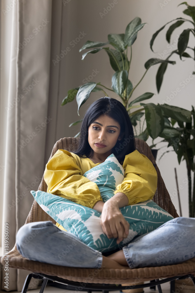 Sad Indian woman hugging pillow tightly while sitting curled up in chair, suffers from loneliness, feeling alone or missing beloved one, dealing with bad news, break-up, reflects on difficult decision