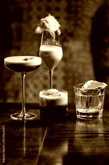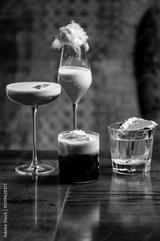 A stylish display of four colorful cocktails on a vibrant textured background. Each drink features unique garnishes, such as cotton candy and decorative shells, creating a festive atmosphere.