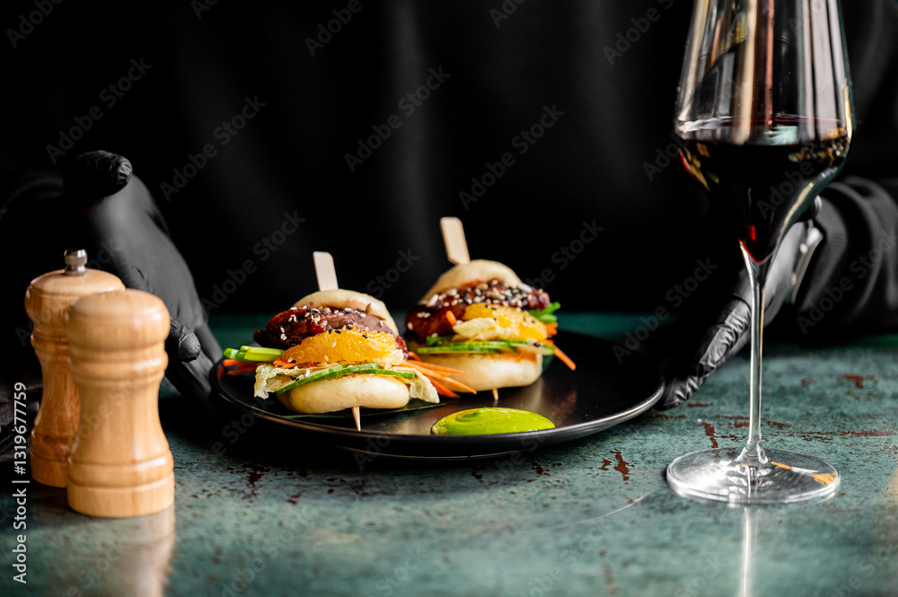 A stylish plate with gourmet mini burgers topped with fresh ingredients, accompanied by a glass of red wine. The setting features a modern dining ambiance, enhancing the culinary experience.