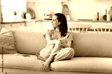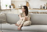 Full length portrait relaxed beautiful young woman sit on sofa in relaxed pose at cozy kitchen interior unwind reduce stress listen to soothing lounge music in wireless earbuds connected to smartphone