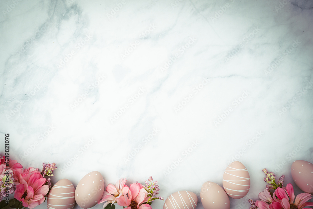 Happy Easter background with easter eggs and spring flowers. Easter background with copy space. Flat lay. High quality photo with marble background