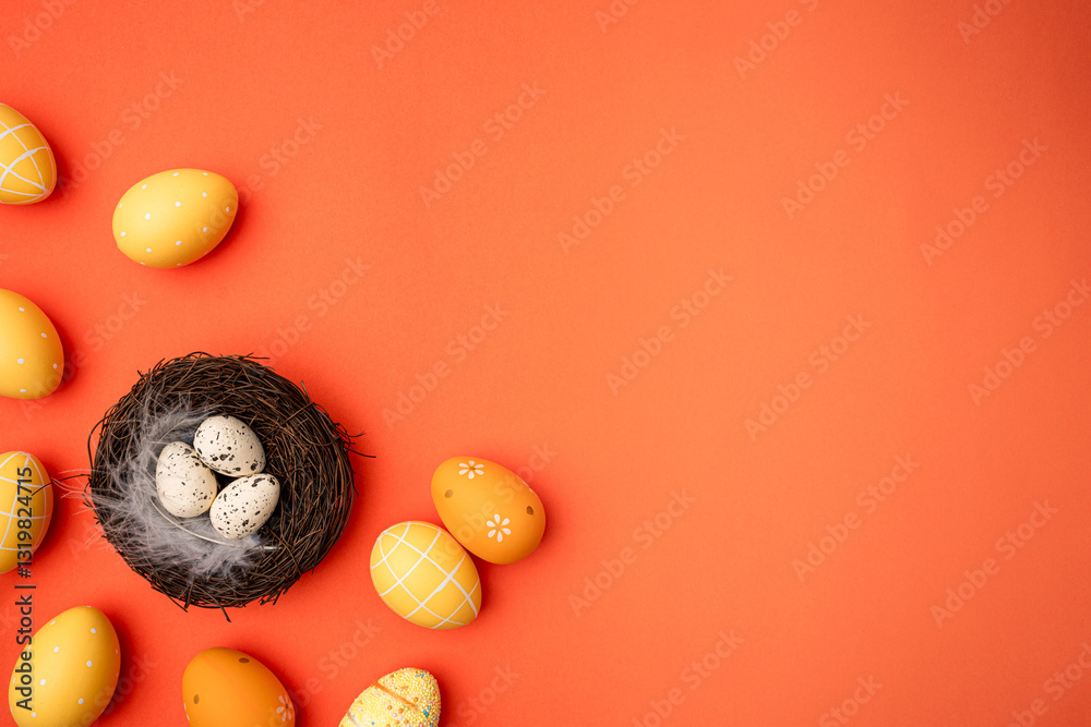 Happy Easter background with easter eggs in nest. Easter background with copy space. Flat lay. High quality photo with orange background
