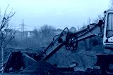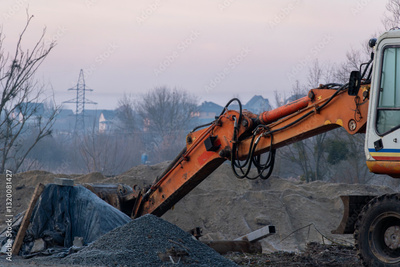 A large construction excavator digs into a mound of gravel at a worksite, surrounded by a misty landscape, revealing a quiet start to the day